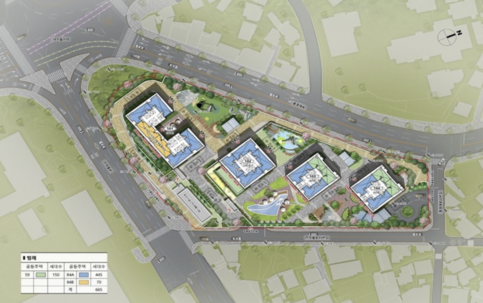 이 단지의 대지 면적은 14,679㎡, 연면적은 약 110,560㎡로, **건폐율 24.16%, 용적률 499.65%**라는 효율적인 설계가 돋보입니다. 지하 4층부터 지상 30층~42층까지 총 4개 동으로 이루어진 대규모 단지이며, 총 665세대를 수용할 수 있습니다. 주차 공간도 충분히 확보되어 세대당 평균 1.5대로, 총 1,001대를 수용 가능한 넉넉한 주차 환경을 제공합니다.