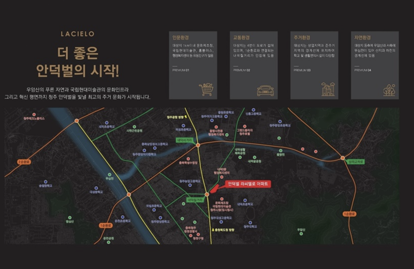 생활 편의성 면에서도 뛰어납니다. 내덕시장, 홈플러스, 율량동 상업시설이 인근에 위치해 있어 의·식·주를 한 번에 해결할 수 있는 환경을 제공합니다. 또한 청주시청, 청원구청과 같은 행정 시설은 물론, 문화제조창, 국립현대미술관과 같은 문화시설도 가까워 문화 생활을 즐기기에 매우 유리한 위치입니다.